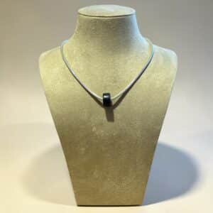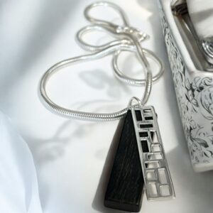 À partir de 95 €Pendentif homme original, ce fragment de Morta brut incrusté de 2 plaques d’argent se porte en ras de cou ou légèrement plus bas. Son aspect géométrique naturel rappelle la force du chêne des marais de Brière. La créatrice a dessiné ce pendentif dans la longueur pour mettre en valeur la noblesse du bois et le poids des 5 000 ans de fossilisation. Disponible en plusieurs longueurs pour la chaîne à mailles rail en acier inoxydable pour accentuer la silhouette rectiligne du bijou (60 – 55 – 50 – 45 cm) ou 45 cm sur cordon de cuir bovin tressé pour renforcer l’aspect rustique.