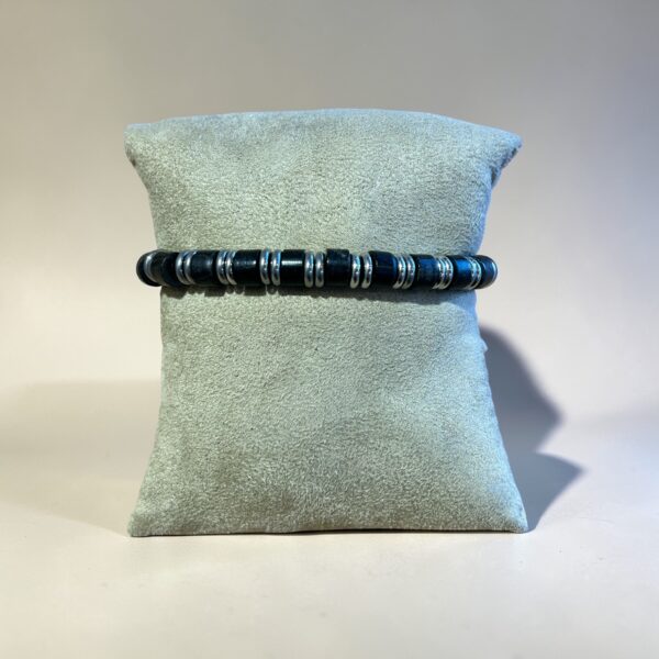 Avec ce bracelet femme de la collection Galilée, la créatrice donne le ton ou plutôt le bi-ton. Un bracelet du genre bohème avec un jean ou un blouson, citadin et chic avec une tenue sobre. Entre le noir du Morta et l’éclat de l’acier inoxydable, il joue les clairs-obscurs sur votre poignet. Fabriqué sur mesure, il tient parfaitement sa place et s’associe facilement à une montre ou à un autre bracelet déjà en place. Ses anneaux de Morta et d’acier mesurent 8 mm de diamètre. Ils glissent sur un élastique de 1 mm pour une parfaite aisance. Bracelet fait main dans notre atelier de Brière.